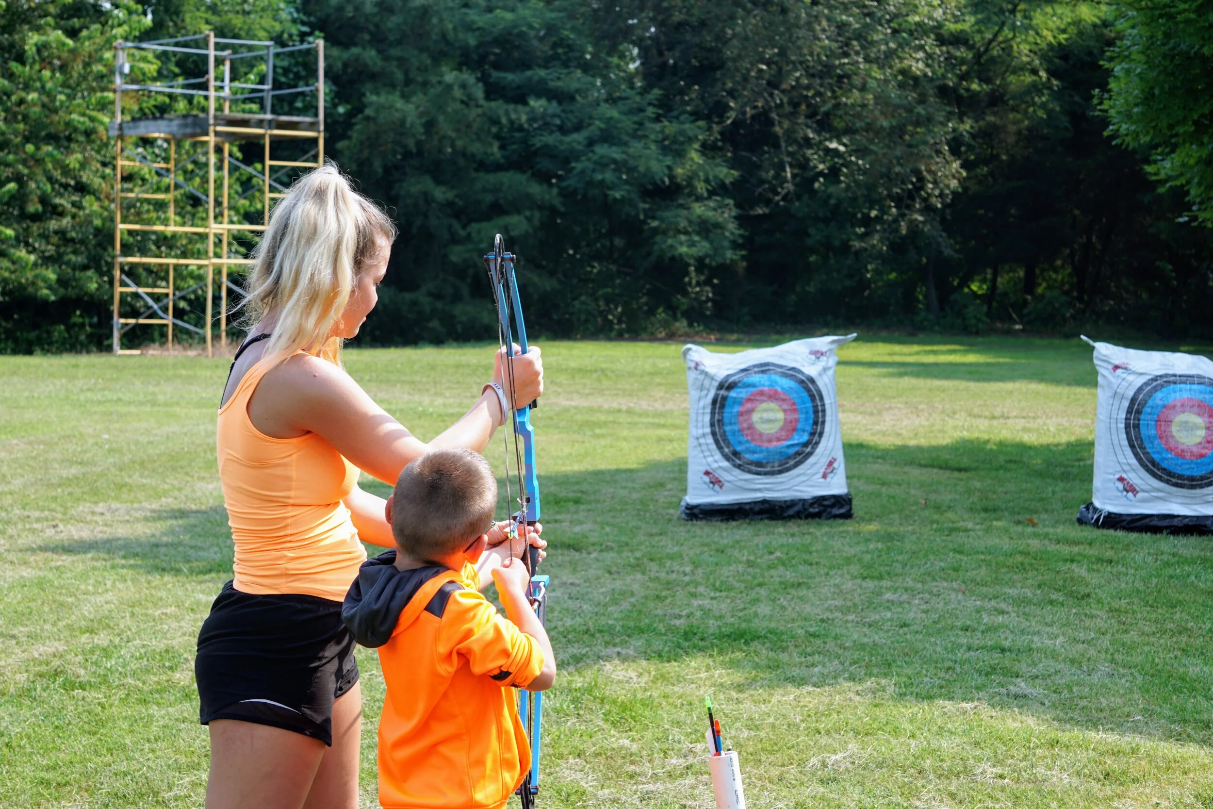 Counselor teaching a camper how to shoot a bow and arrow at archery